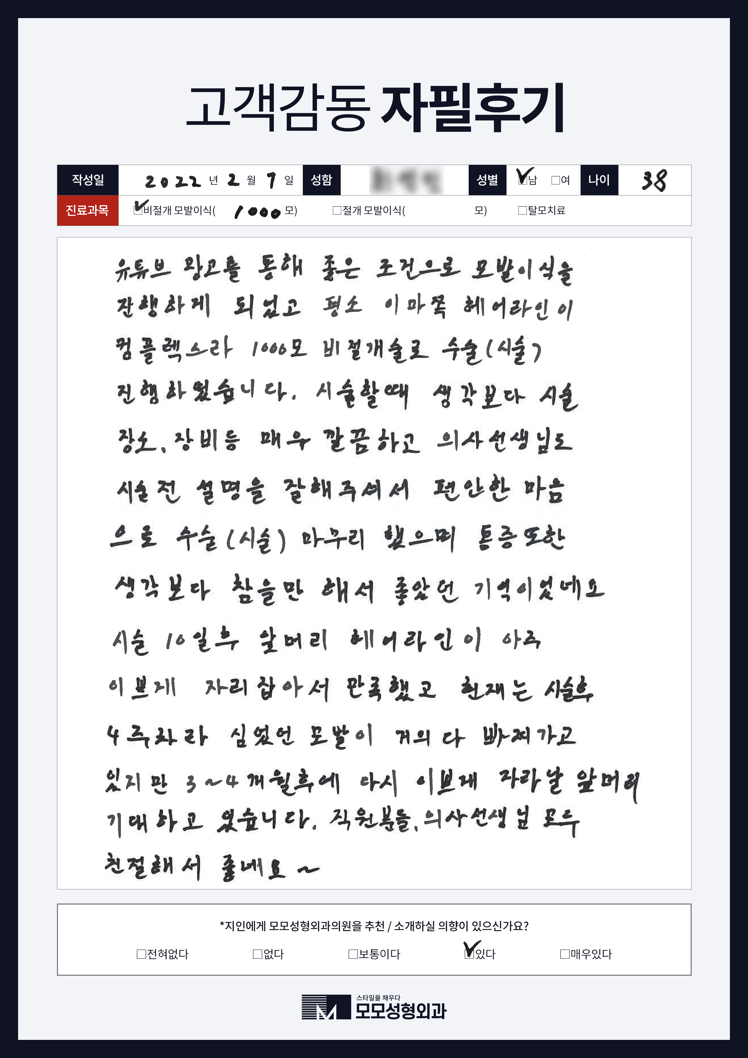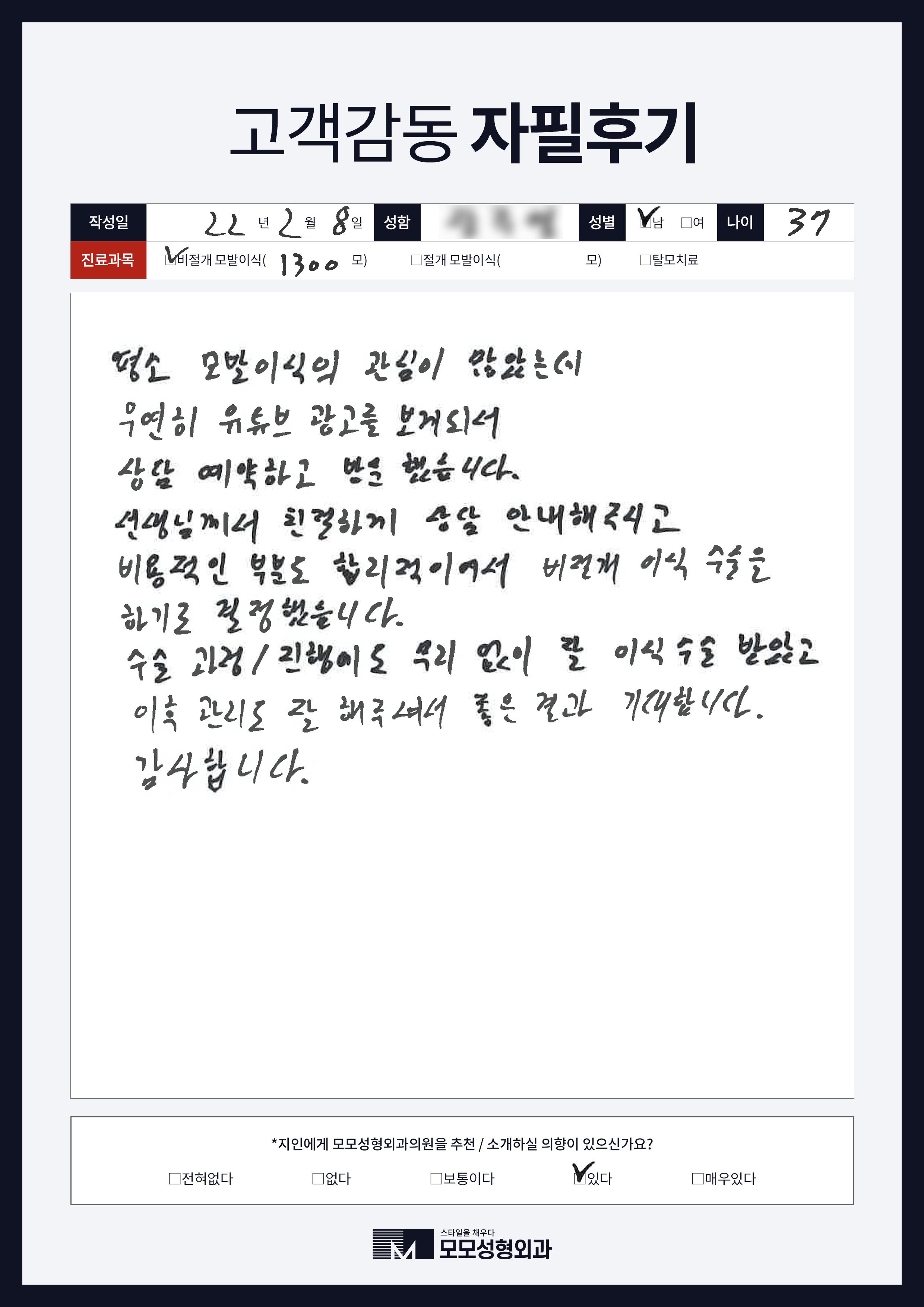 [30대]비절개모발이식1000모, M자이마