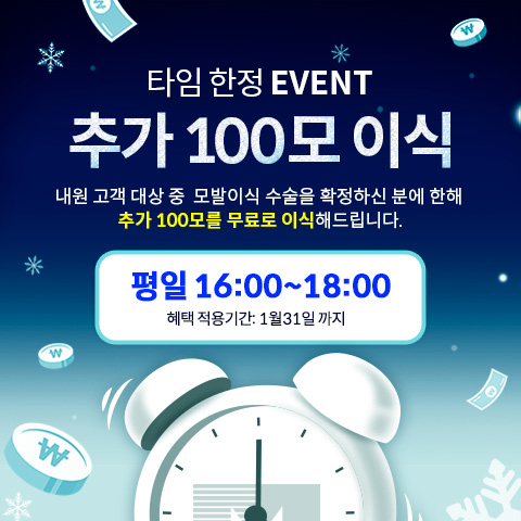 본문콘텐츠영역 이벤트 전체 전체 남성 모발이식 여성 모발이식 탈모 프로그램 전체 남성 모발이식 여성 모발이식 탈모 프로그램 이벤트 종료 모모성형외과 서울점 개원 3주년 기념 이벤트 타임 한정 EVENT 추가 100모 무료 이식 (평일 16시~18시 내원 고객 대상)